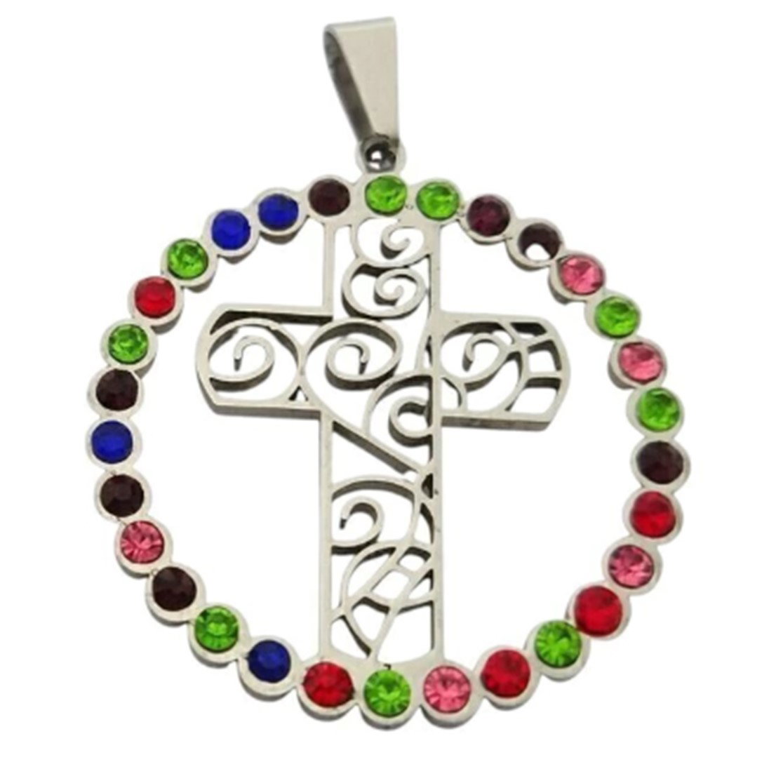 DIJE CRUZ CON STRASS DE COLORES GRANDE - Acero quirúrgico