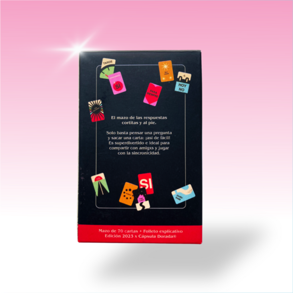 El oráculo de las respuestas cortitas y al pie. Solo basta pensar en una pregunta y sacar una carta, así de fácil. Es superdivertido e ideal para las juntadas con amigas/os y jugar con la sincronicidad. Una propuesta lúdica diferente para llenar de magia esos encuentros.