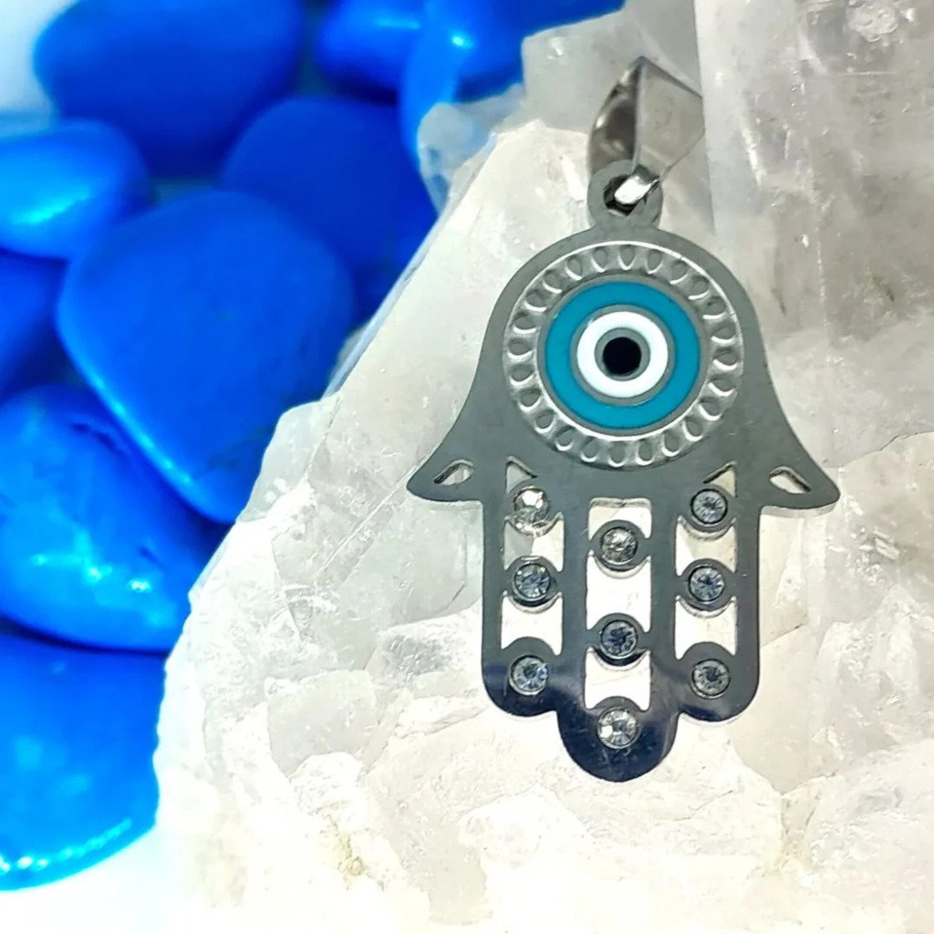 DIJE MANO DE FATIMA CON OJO TURCO Y STRASS - Acero quirúrgico