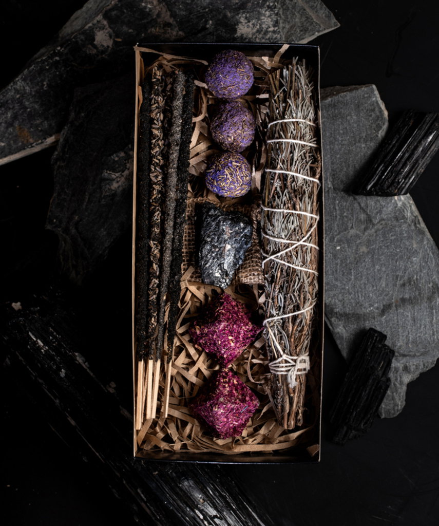 Contiene: 2 sahumerios de copal, 2 sahumerios de incienso, 2 sahumerios de lavanda, 2 pirámides de rosa, 3 bombitas de lavanda y olíbano, 1 sahúmo de hojas de lavanda, 1 cristral de turmalina y 1 díptico explicativo.