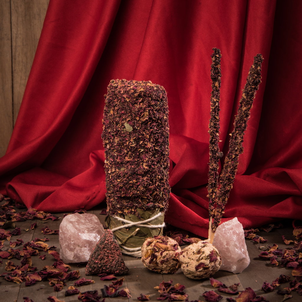 Contiene: 2 sahumerios de rosas y olíbano, 1 sahúmo de rosas, 2 bombitas de pétalos de rosa y olíbano, 1 trangulito de rosas y olíbano, 1 cristral de cuarzo rosa y 1 tríptico explicativo.