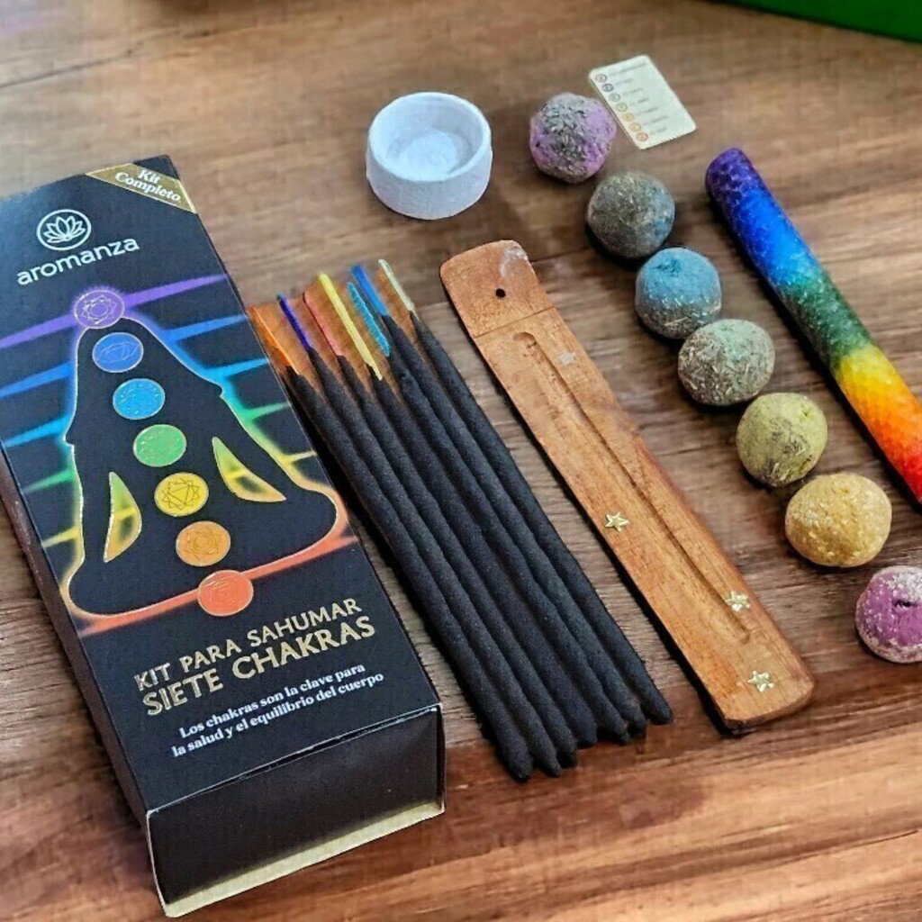 Contiene: 7 sahumerios tibetanos, 1 vela de miel 7 chakras, 7 esferas mágicas 7 chakras y 1 porta sahumerios de madera.