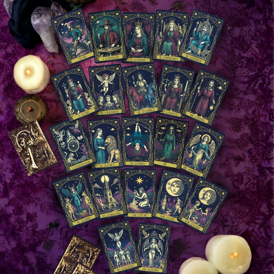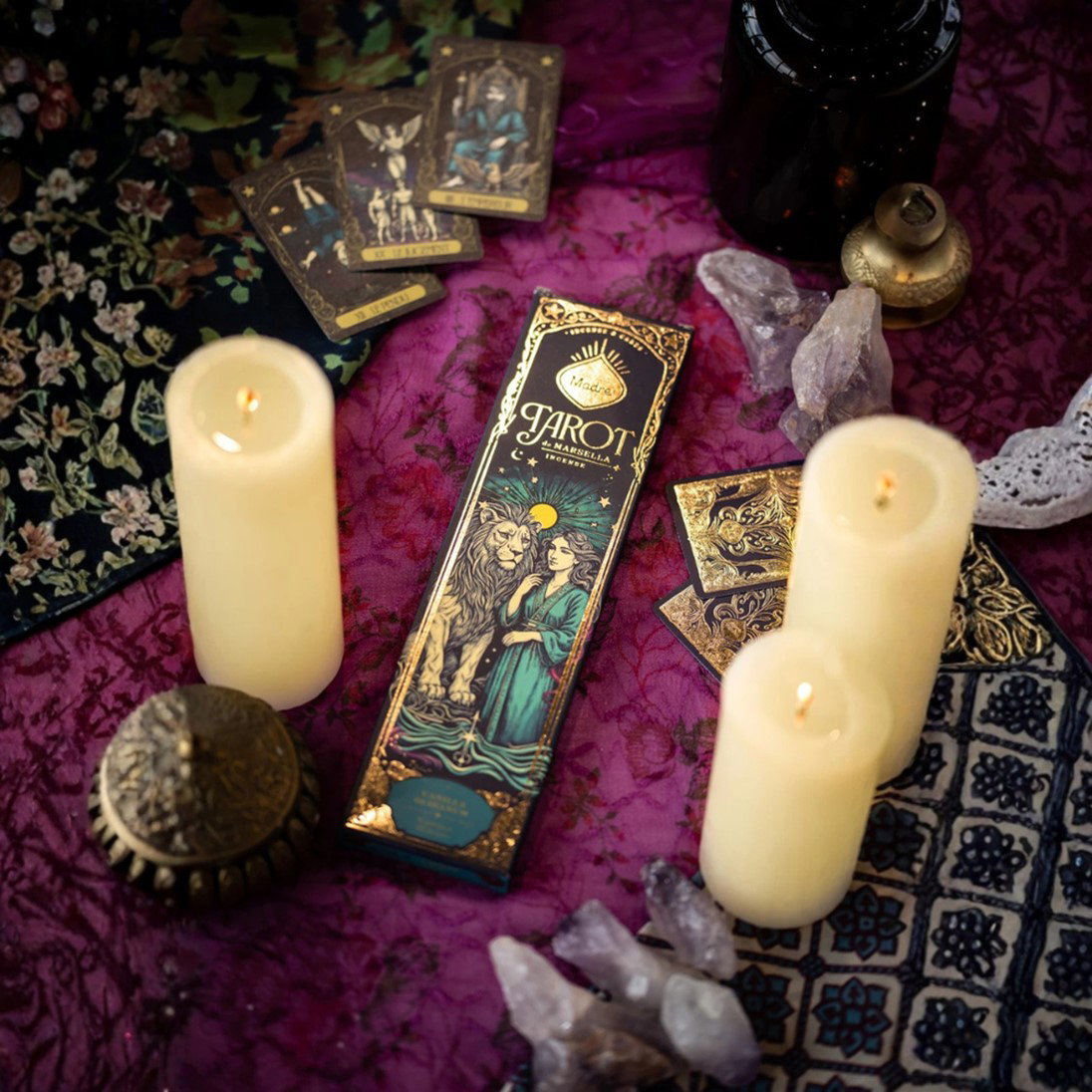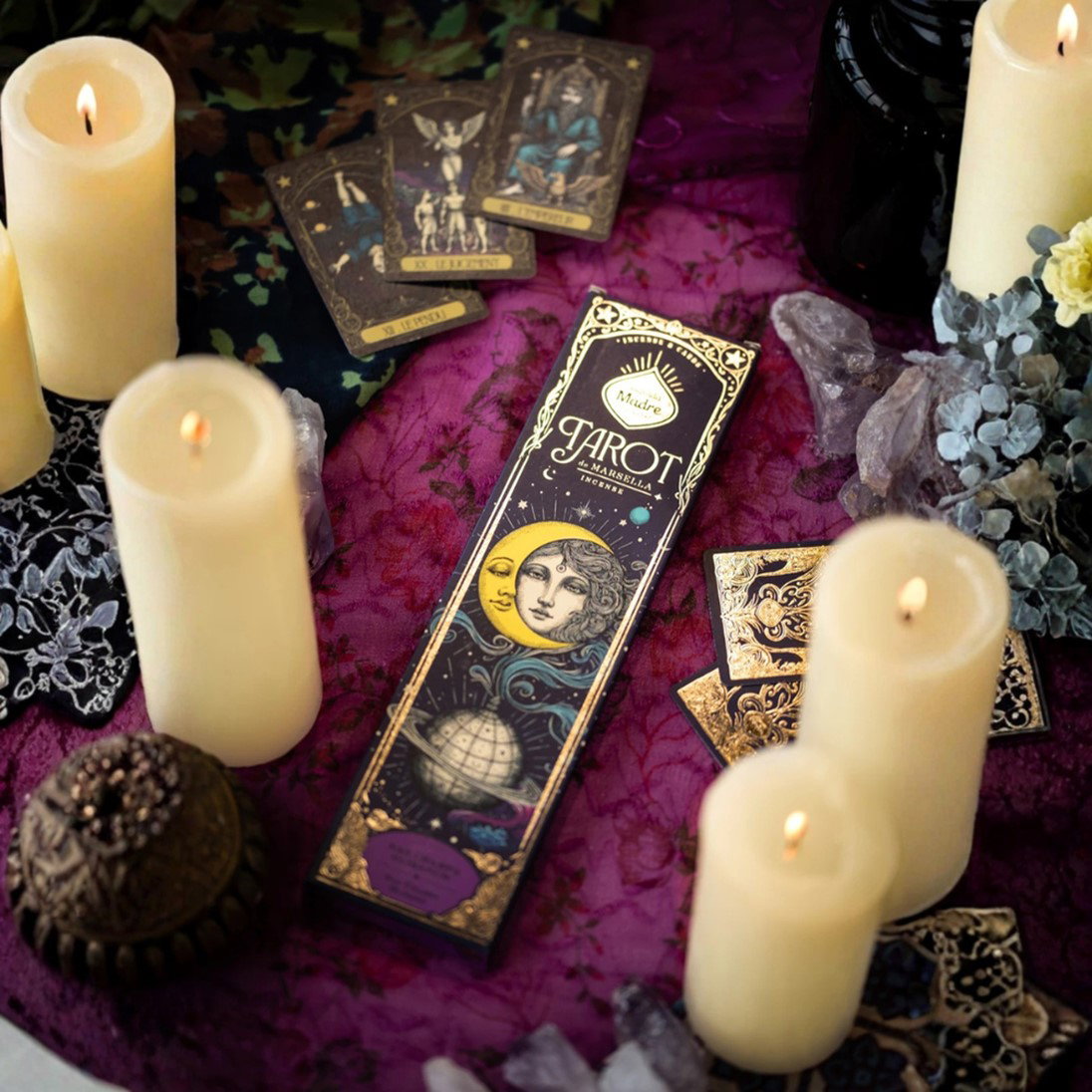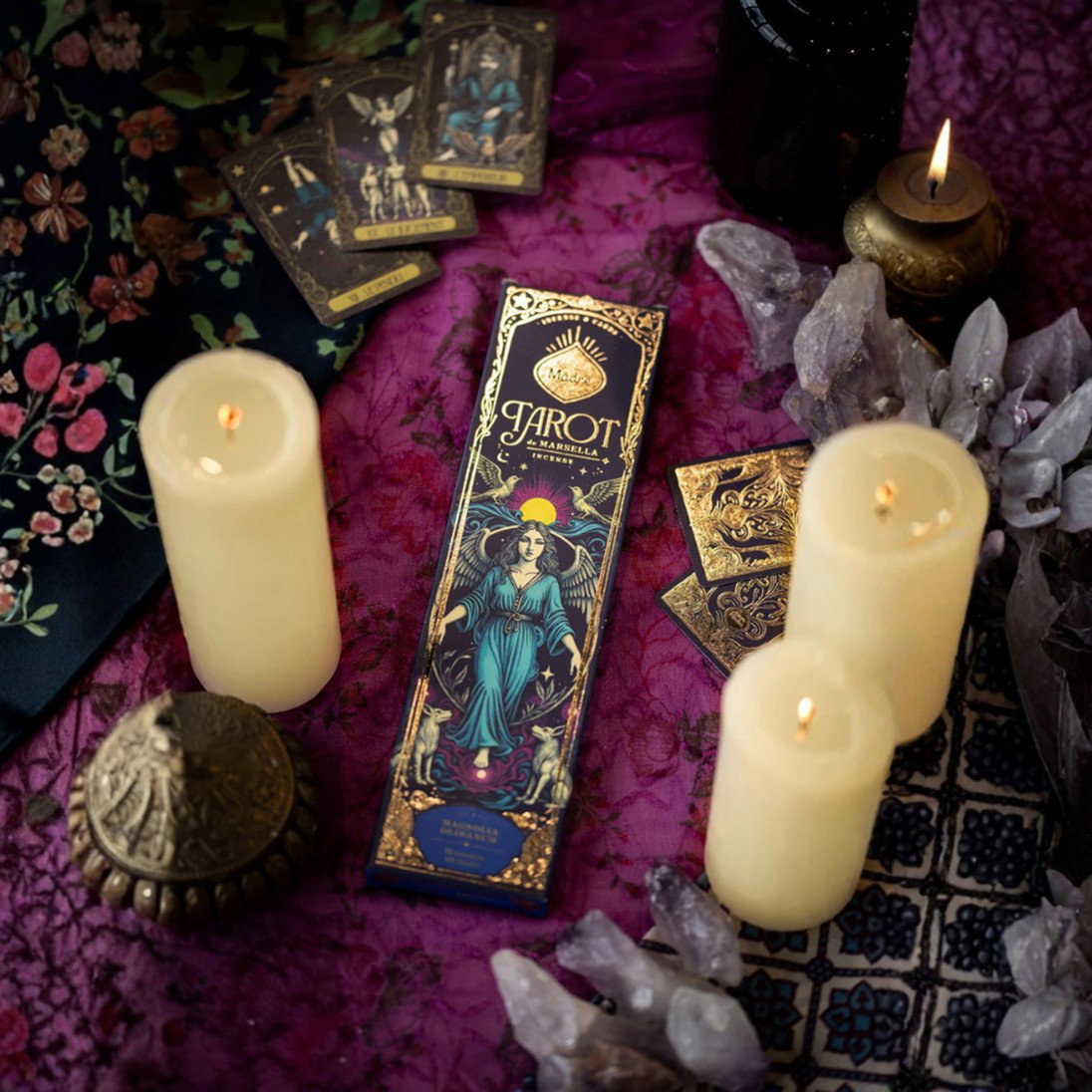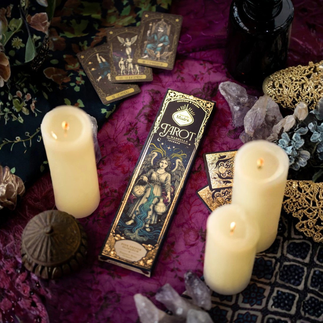 Contiene 6 varillas de aroma intenso y dos cartas del Tarot de Marsella.