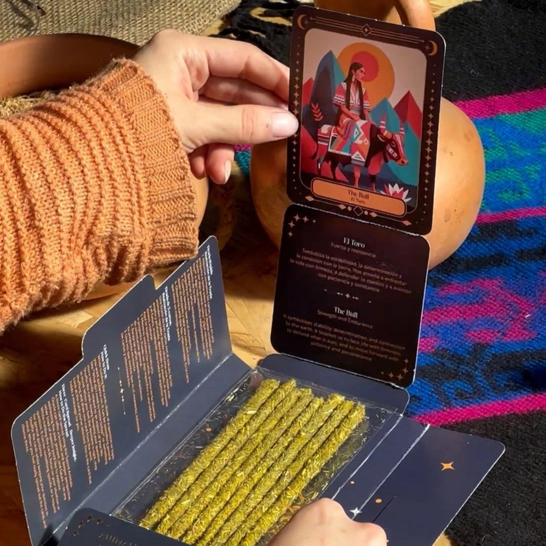 Contiene: 1 carta oráculo sorpresa (de 12 coleccionables) y 8 varillas con aroma a jazmín, rosas y limón.