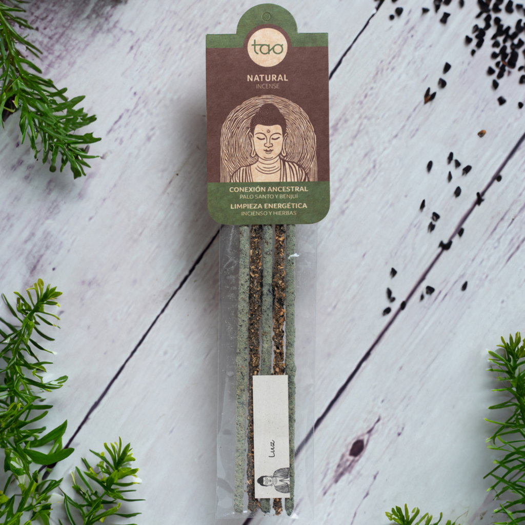 Conexión ancestral + limpieza energética: varillas de hierbas e incienso y varillas de palo santo y benjuí.